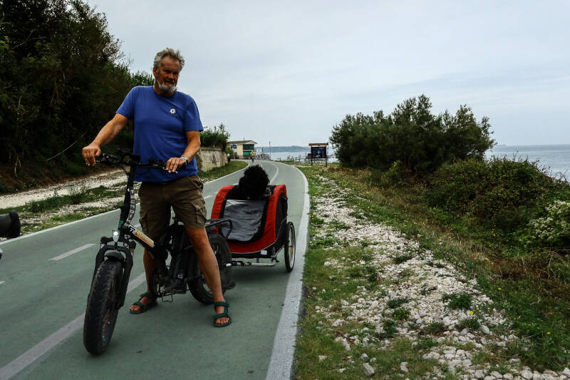 Vanochtend na veel heen en weer gebel en ge-app is het eindelijk gelukt een ticket te reserveren voor de overtocht vanuit Bari naar Igoumenista op zondag de 24 ste, dus nog 3 dagen ons hier zien te vermaken, dat lukt wel maar dat drukkende weer komt me de strot uit. Okay, vanochtend lopend naar het stadje en daar hebben we Fatbikes gehuurd met een kinderkar erachter voor Wally. Die dingen waren elektrisch en gingen echt loeihard, wat een power. Moest echt opletten met de bochten en zo.