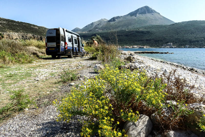 Vanachtend vertrokken richting Kardamilli, dat ligt op het andere uitsteeksel van de Peloponnesos en heet Mani. Dit plaatsje zijn wij zo’n 25 jaar geleden ook geweest en de camperplek die we voor ogen hadden, waarvan wisten we waar die lag, en dat was mooi dachten wij. Het stadje zelf herkende we niet meer terug. Toen, 25 jaar terug was het een stil en niet toeristisch stadje, nu niet meer. Toch had het veel charme, zoals zoveel toeristische stadjes hier in Griekenland. Komt door het ongelooflijke ontspannen sfeertje hier overal. Ons plekje waar we wat langer wilden blijven was echter niet meer zoals 25 jaar terug. Druk en overal ligbedjes. Ronaldinus vindt het dan wel prima, maar Aagje niet, dus even wat gegeten en op zo’n uur verder gaan rijden. De plekjes zijn spaarzaam hier in dit gedeelte. Weinig strand, maar uiteindelijk staan we nu op een prima en mooie plek.