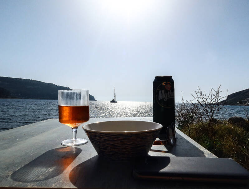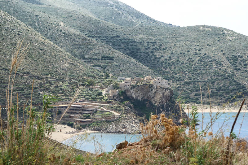 Dan belanden we in het haventje Porto Kogia, en dan ben ik verliefd. Wat een plaatje, er loopt niet eens een verharde weg doorheen.