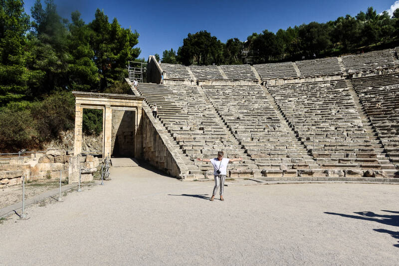 Uiteindelijk weer gaan rijden richting Epidaurus, want dat bleek hier niet te ver vandaan te liggen. Ik schaam me diep om in een land met zoveel geschiedenis en oudheden te zijn en wat we er van zien is nihil. We konden de Kolonel parkeren onder de bomen, dus eindelijk even op pad zonder Wally. Eén ding moet ik nu voorgoed in mijn oren knopen. Onderneem geen activiteiten met een flinke lunch met wijn in je mik!! Het was prachtig het oude theater, maar warm en klimmen, dus ik stond gelijk weer in de sproeistand.