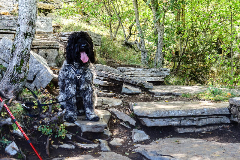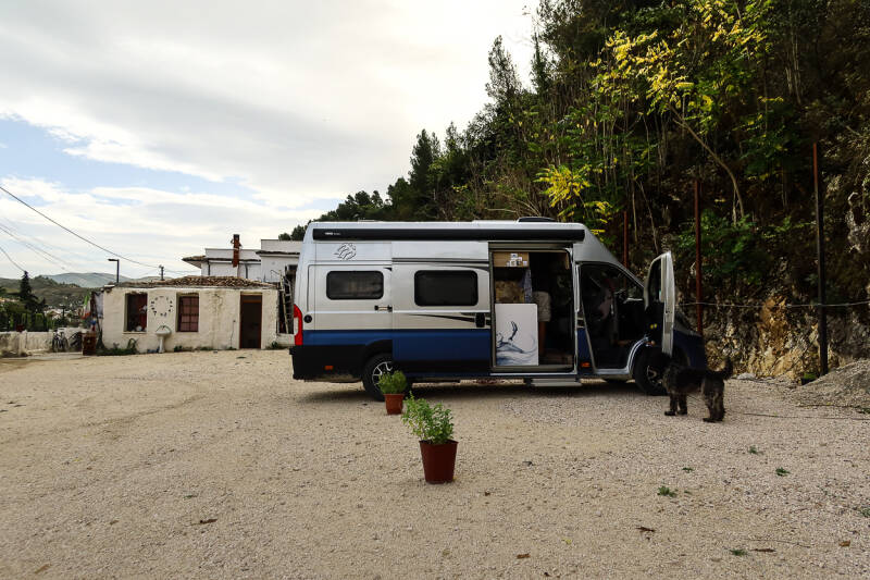 Laatste slaapplek in Griekenland, zo’n 10 km van de Albanese grens. Wally vindt het heel spannend hier, ruikt w.s wilde zwijnen want die zijn hier talrijk aan de sporen te zien.
