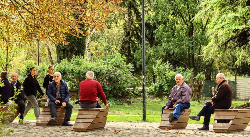 Iets wat gelijk opvalt in Albanië is de vele mannen die op terrassen zitten of in parken. In Griekenland is dit ook, maar hier zie je amper vrouwen op terrassen en in parken. Het ziet er allemaal reuze relaxt uit, al die keuvelende mannen, maar waar zijn de vrouwen? Huis schoonmaken, aan het werk?. Volgens mij is het in Nederland vaak andersom, op terrassen zie je doorgaans vrouwen en vriendinnen die lekker zitten te "wijnen".