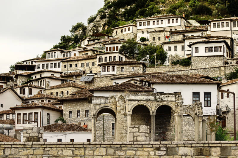 Door een beetje nietszeggend landschap zijn we naar Berat gaan rijden. Berat wordt de stad met de duizenden ramen genoemd en moet één van de mooiste stadjes van Albanië zijn. Veel is natuurlijk verwoest in het land tijdens het communistische tijdperk. Alles moest wijken voor propagandistische gebouwen en typische oostblok-wijken met grauwe flats. Berat en nog een aantal steden zijn hier aan ontkomen.