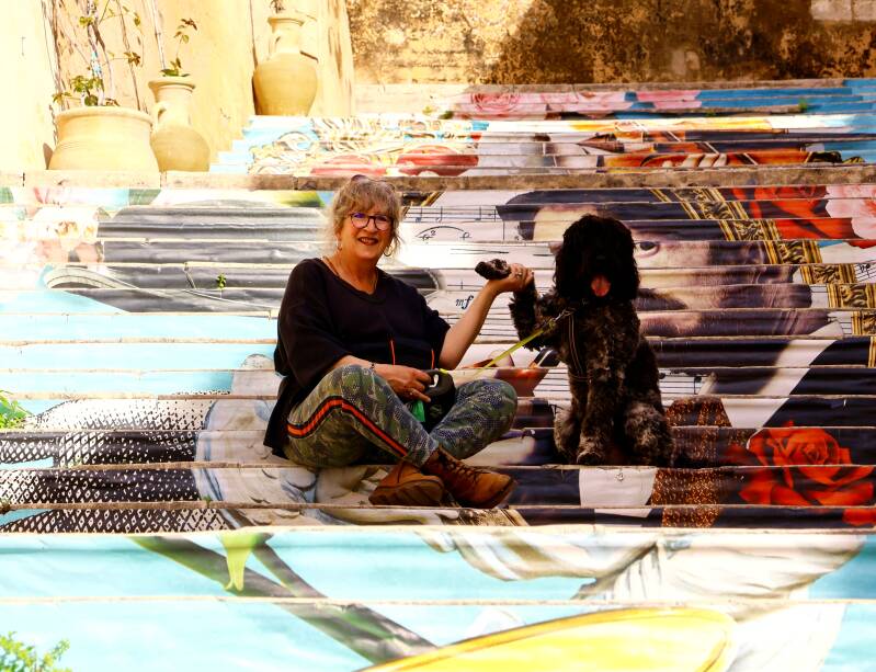 Wally is hier een beetje de lellebel van de camperplaats. Ligt constant op zijn rug om aangehaald te worden. Dit aardige Nederlandse meisje heeft een uur zo met hem gezeten, en the Wall, die heeft nooit genoeg.