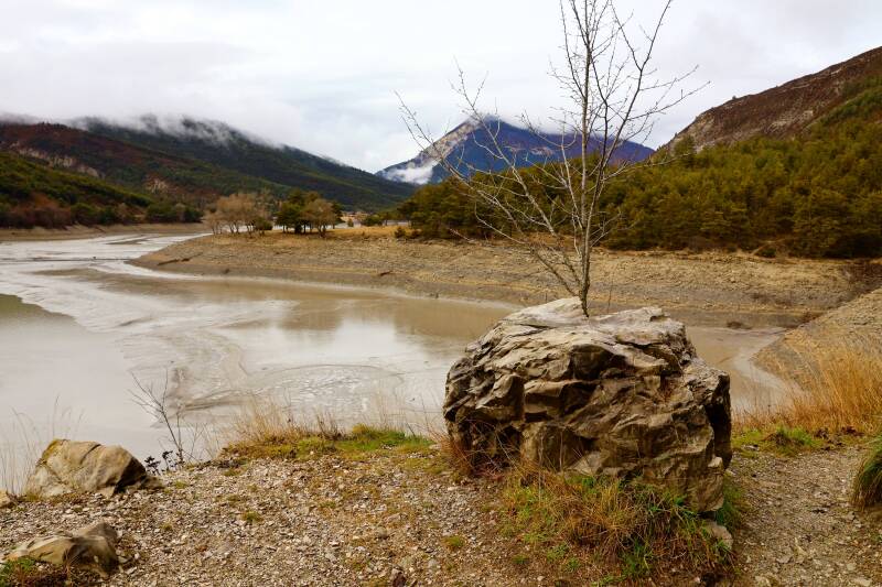 Het stuwmeer staat helemaal leeg. Normaal gesproken in het een nooi blauwgroen meer.