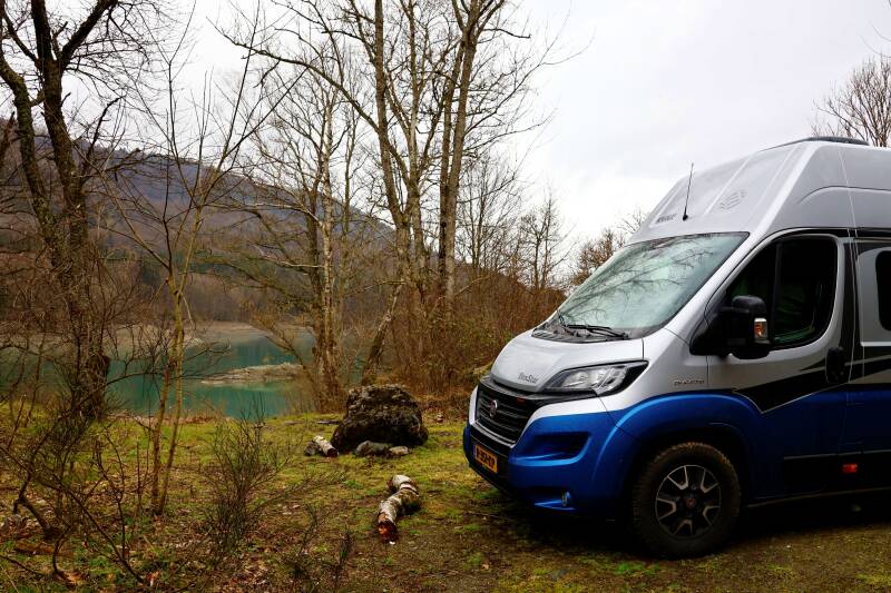 Okay, naar Antibes...nog nooit geweest en het regent ondertussen pijpenstelen, we kunnen geen parkeerplek vinden en zijn er helemaal klaar mee met die drukke kust hier. Hoppa...de binnenlanden in en we rijden een echt prachtige route door een kloof langs de rivier Var. We zoeken een mooie P4N plek aan het stuwmeer Lac de Castillon in de Haute Provence.