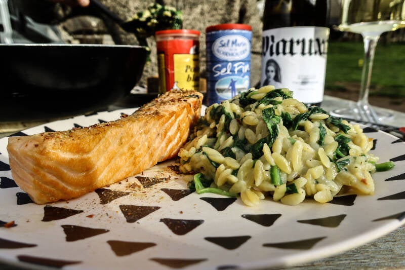 We hadden trek vanmiddag en de zon scheen, dus lekker buiten gekookt en gegeten. Zalm op de gril en orzo met spinazie. Tjemig wat zijn we verantwoord bezig, wel een lekker fles Godello er bij, dat dan weer wel...