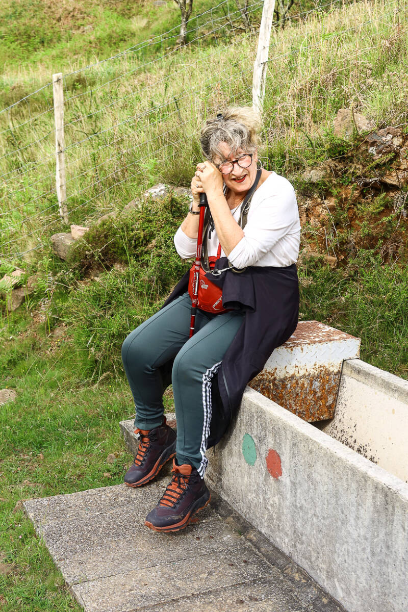 Oma, zo noem ik mezelf maar tegenwoordig, moet zo nu en dan een rustpauze nemen als we bergopwaarts gaan. Met mijn mooie nieuwe en dure wandelschoenen, die werkelijk voor geen meter lopen op rotsachtig terrein, niet waterdicht blijken te zijn en allerlei pijnlijke punten heeft in de schoen, dus behalve dat ze er wel kek uitzien zijn ze...waardeloos!!! Van Revolution Race zijn ze. Gelukkig heb ik mijn oude Meindels ook nog bij me.